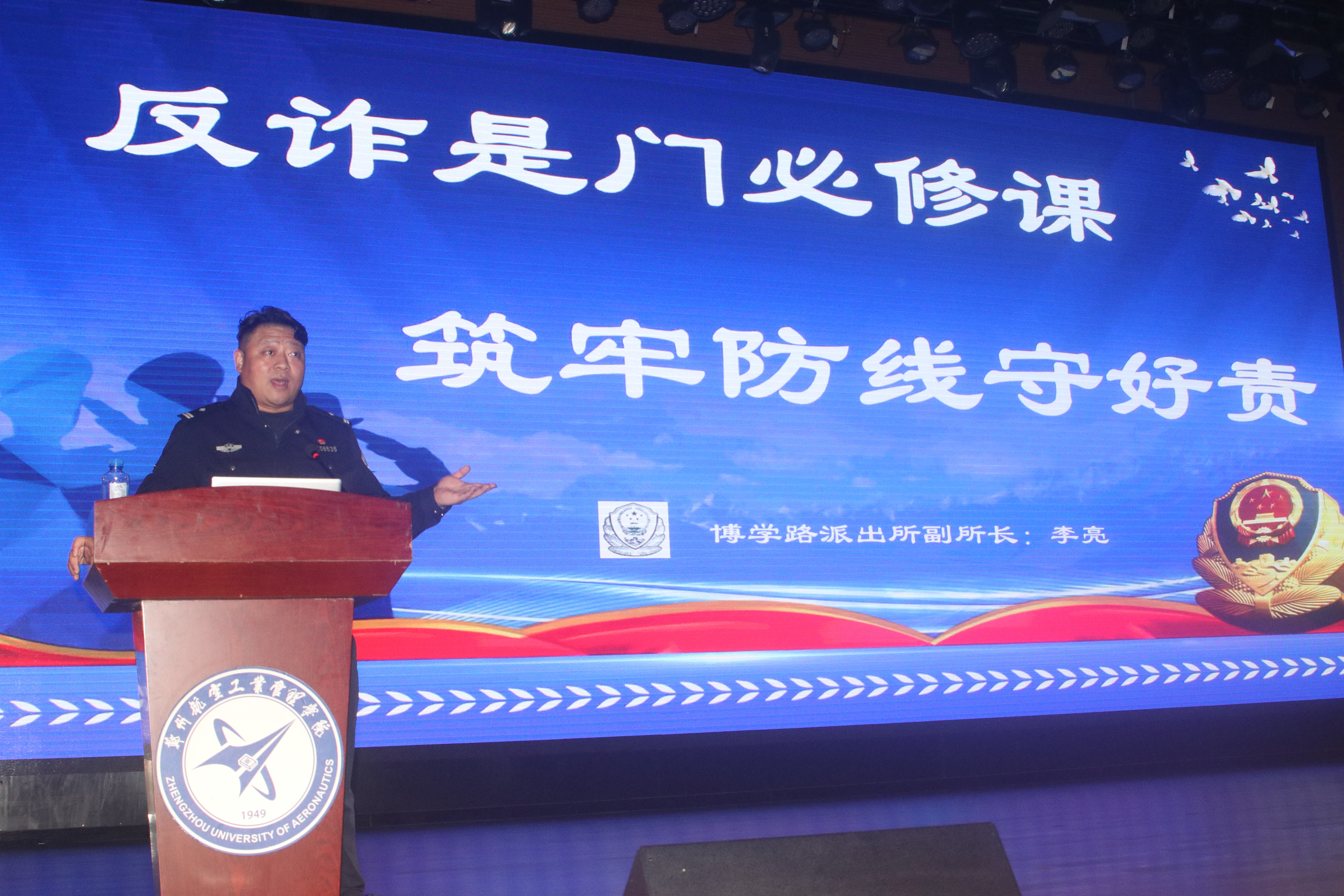 博学路派出所副所长李亮结合郑州高校真实案例,详细剖析了冒充好友、网络刷单、游戏账号交易、虚假购物、冒充客服等常见诈骗手法的作案套路和识别关键,为在场的师生上了一堂生动的反诈宣传课。他指出高校学生是易受骗群体,希望同学们进一步提升反诈意识,保护好个人财物,守牢安全底线,并给出了“不轻信、不透露、不转账、要及时报警”的实用防范指南。