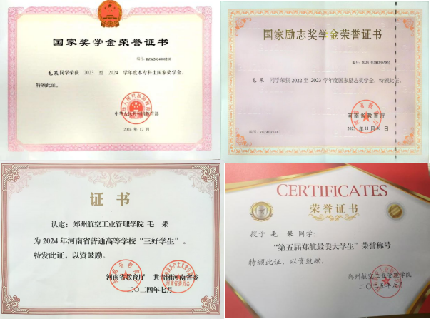 学习上,毛果同学勤奋刻苦,成绩优异,连续两年综合测评成绩专业排名第一,曾获国家奖学金、国家励志奖学金、河南省“三好学生”、郑州航院“最美大学生”等多项荣誉。