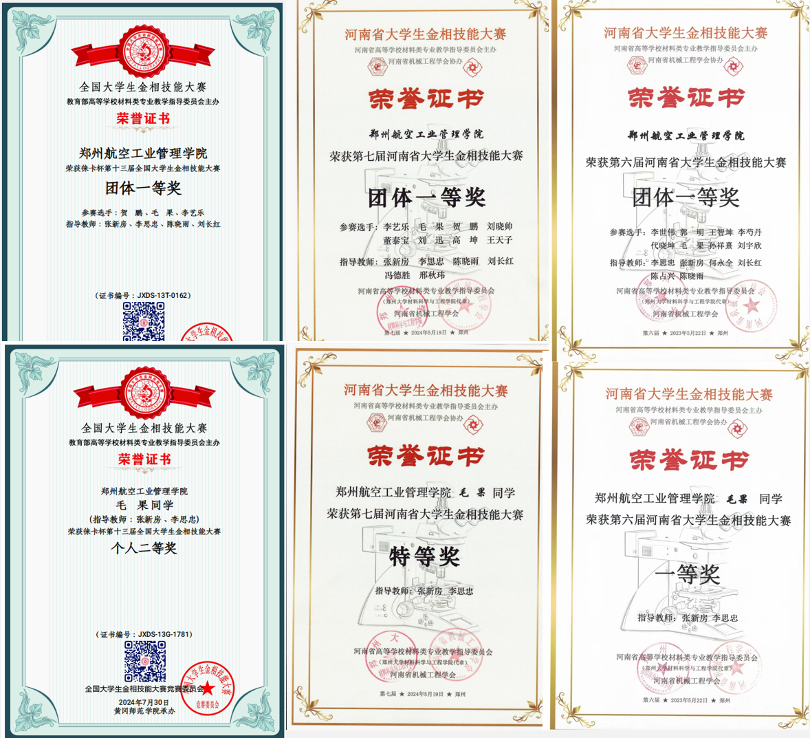 实践创新上,他积极参加科技创新、学科竞赛类活动。曾获第十三届全国大学生金相技能大赛团体一等奖(全国第五名)、第六届河南省大学生金相技能大赛中获得团体一等奖和个人特等奖优异成绩。此外还主持省级大学生创新项目一项(《基于新型电渣重熔技术的GH4096高温合金均匀化热处理及组织调控研究》)。