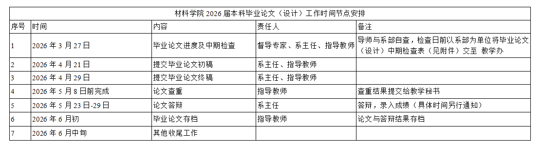 材料学院2026届本科毕业论文(设计)工作时间节点安排